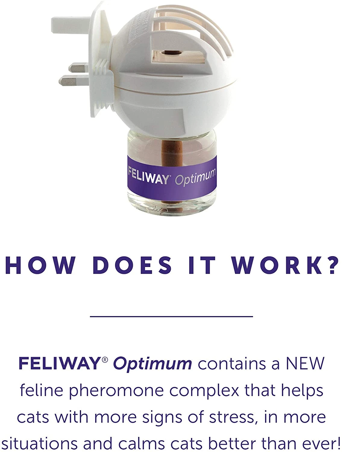 FELIWAY Optimum is BRAND NEW to the FELIWAY range and now calms cats better than ever in more situations for enhanced serenity. It contains a new feline pheromone complex that conveys even more impactful messages to your cat which helps them cope with our modern lifestyles. Cats turally produce pheromones, some of these are invisible calming messages. FELIWAY Optimum contains the most advanced Feline Pheromones Complex, developed by the FELIWAY research team. FELIWAY Optimum helps cats with more signs of stress including:-Scratching-Urine Spraying-Tensions & Conflicts-Environmental changes (eg moving home, new baby)-Fears & anxietiesAvailable as a home diffuser which has been designed to be plugged in and left on. FELIWAY Optimum has a 9.1/10 Cat owner satisfaction FELIWAY Optimum is BRAND NEW to the FELIWAY range and now calms cats better than ever in more situations for enhanced serenity. Supported by 25 clinical papers NEW FELIWAY Optimum contains the most advanced Feline Pheromones Complex, to convey more impactful messages to calm your cat better than ever. FELIWAY Optimum helps your cat feel comfortable and secure at home providing reassurance and ensuring harmony between cats. Trusted and used by vets, charities and behaviourists Scentless and species specific – no effect on humans or other pets