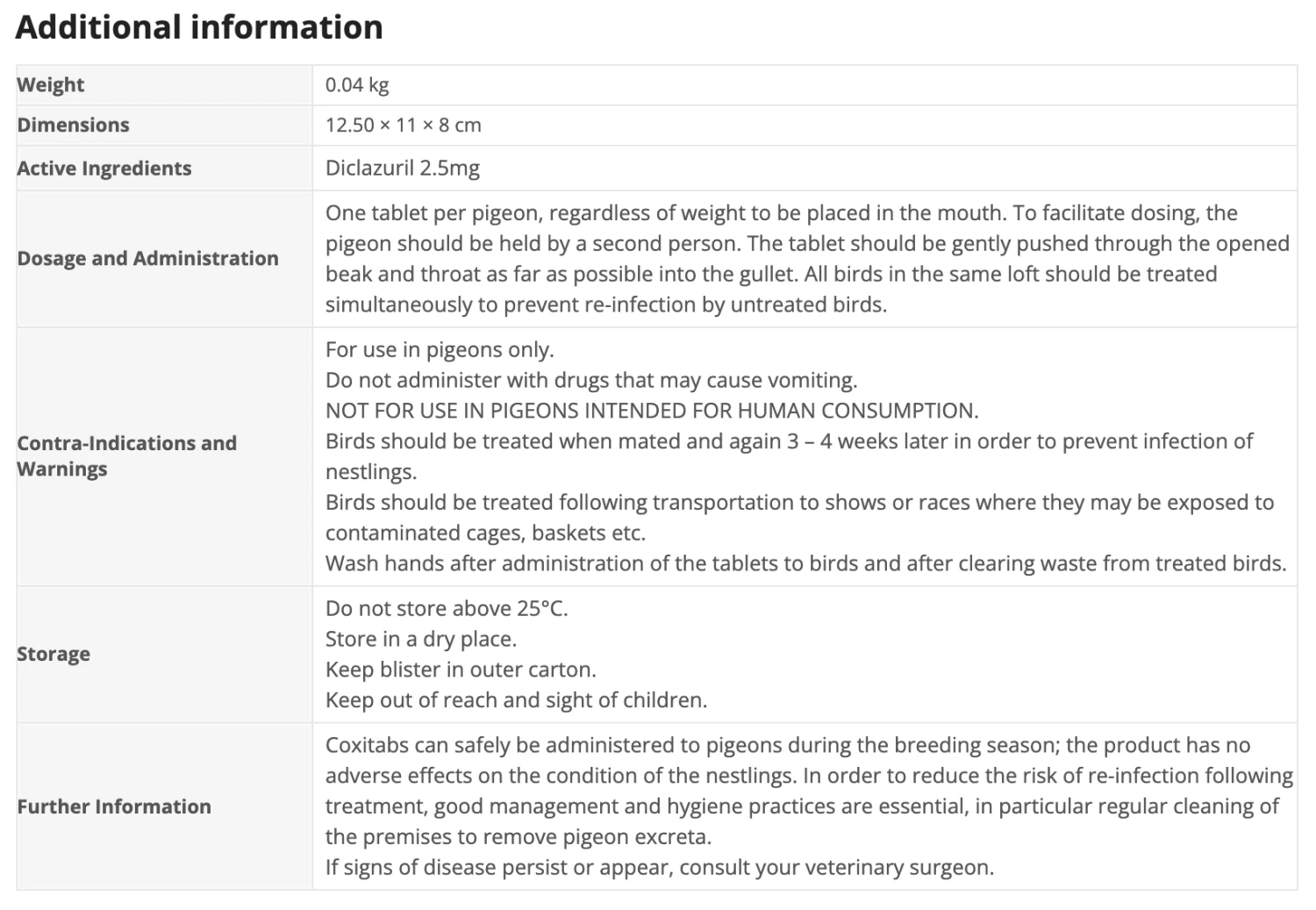 | Further Information | Coxitabs can safely be administered to pigeons during the breeding season; the product has no adverse effects on the condition of the nestlings. In order to reduce the risk of re-infection following treatment, good management and hygiene practices are essential, in particular regular cleaning of the premises to remove pigeon excreta. |