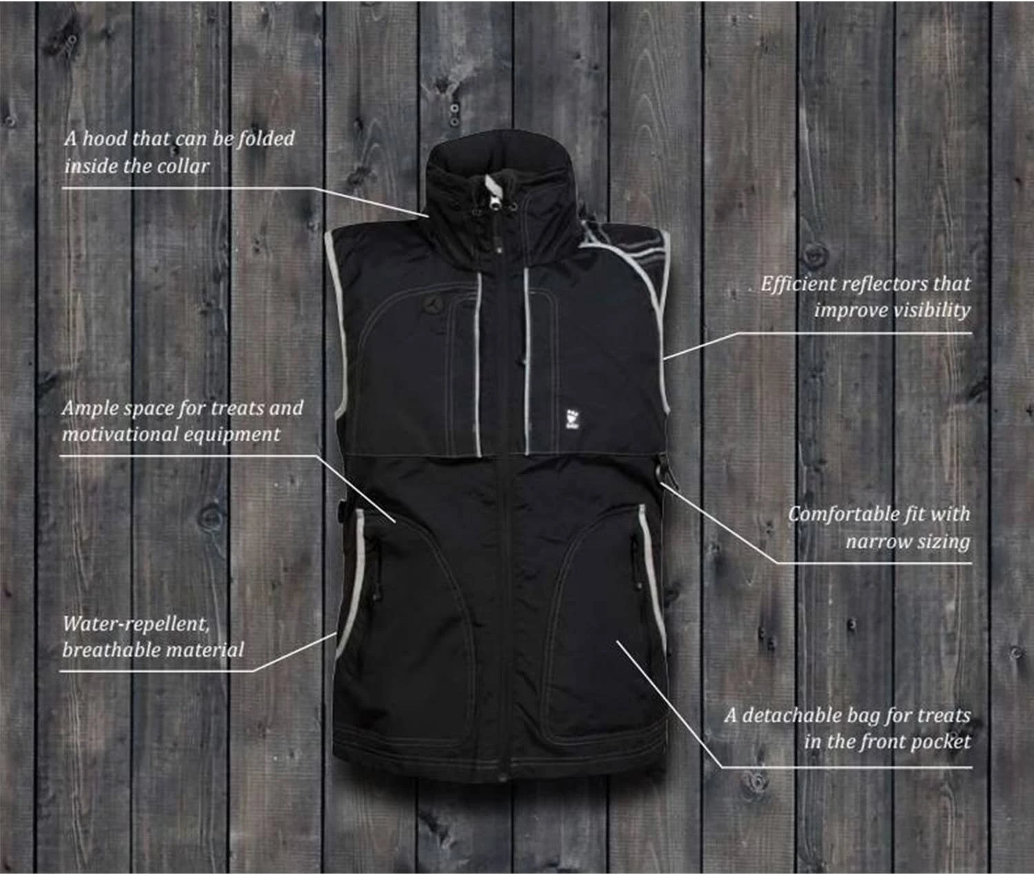 The front of the vest has four zipped pockets and two large pockets for treats and motivational toys. Large back and breast pockets have plenty of room for training dummies or accessories. The shoulder has a Velcro™ fastener for attaching motivational toys, rings, and clips are strategically located around the vest.