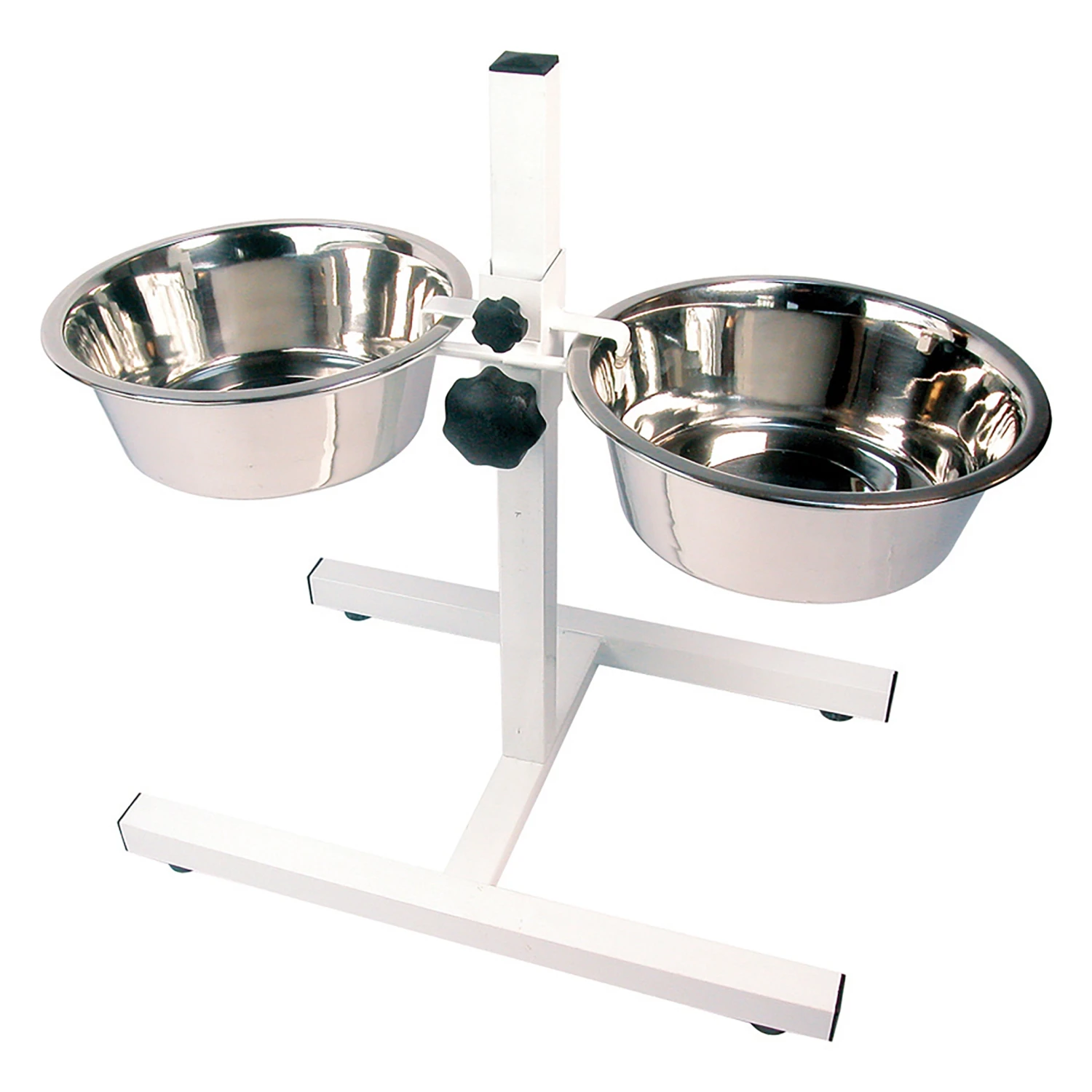 Two bowls in a holder for dogs. Bowl level adjusts to fit your dog at any age or stage. Aids digestion and reduces neck and joint strain by allowing your dog to stand upright in a more relaxed posture. Stainless steel bowls are dishwasher safe. Available in different sizes (based on size of bowls).