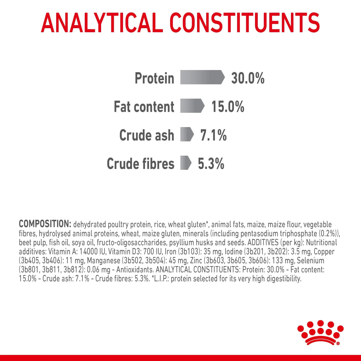 Product composition Dehydrated poultry protein, rice, maize, vegetable protein isolate*, animal fats, maize flour, vegetable fibres, hydrolysed animal proteins, wheat, maize gluten, minerals, beet pulp, fish oil, fructo-oligo-saccharides, soya oil, psyllium husks and seeds. Product additives Vitamin A: 24500 IU, Vitamin D3: 700 IU, E1 (Iron): 36 mg, E2 (Iodine): 3.6 mg, E4 (Copper): 11 mg, E5 (Manganese): 47 mg, E6 (Zinc): 99 mg, E8 (Selenium): 0.06 mg – Preservatives – Antioxidants.
