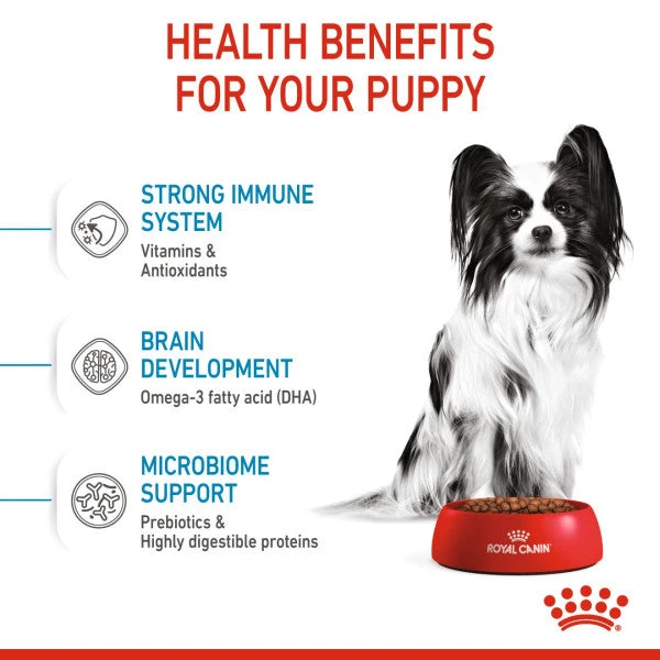 Extra small breed puppies grow incredibly fast. At birth they can weigh as little as an apricot, but by 10 months they can weigh as much as 4 bags of sugar! This growth period is a time when your puppy’s bones, muscles, senses, and nervous system are developing. It’s also a time when the antibodies your puppy got from their mother’s colostrum weaken, meaning they need optimal protein to build their own immune system. ROYAL CANIN® X-Small Puppy is specially formulated to support the nutritional needs of extra small breed puppies. This formula is suitable for 2 to 10-month-old puppies that should reach an adult weight of up to 4 kg. This tailored diet is enriched with omega-3 fatty acids (such as DHA) to help support healthy brain development in puppies. Thanks to a combination of beneficial prebiotics (such as FOS, MOS and beet pulp) and highly digestible proteins, ROYAL CANIN® X-Small Puppy also helps to support a healthy balance of intestinal microbiota (gut flora) for good digestion. This formula also contains nutrients such as vitamins C and E to help support the puppies’ natural defences while their immune systems are still developing. The formula also contains an optimal energy content designed to satisfy the high energy needs of fast-growing, extra small breed puppies. The kibble in ROYAL CANIN® X-Small Puppy has also been specially designed for your puppy’s extra small jaw, making it easy for them to pick up and chew. It also helps to support dental health, thanks to a mechanical brushing effect as your puppy chews. Did you know that a puppy’s nutritional needs change as they grow? By the time your puppy reaches 10 months old, they will need a diet that’s specially adapted to meet their nutritional needs as a grown dog. At this stage, you can transition them onto ROYAL CANIN® X-Small Adult. At Royal Canin, we’re committed to creating a better world for cats and dogs. For more than 50 years, we’ve worked closely with breeders, vets, and pet experts, sharing specialist knowledge and scientific research to create a dedicated approach to individualised, precise nutritional solutions. All of our products undergo an extensive quality control process to guarantee the optimal quality of food. When your extra small breed puppy eats ROYAL CANIN® X-Small Puppy, they’re getting a complete and balanced diet.