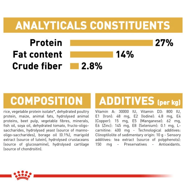 Rice, vegetable protein isolate*, dehydrated poultry protein, maize, animal fats, hydrolysed animal proteins, beet pulp, vegetable fibres, minerals, fish oil, soya oil, dehydrated tomato, fructo-oligo-saccharides, hydrolysed yeast (source of manno-oligo-saccharides), borage oil (0,1%), marigold extract (source of lutein), hydrolysed crustaceans (source of glucosamine), hydrolysed cartilage (source of chondroitin).