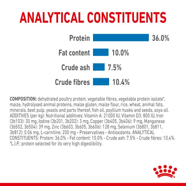 Product composition Dehydrated poultry protein, vegetable fibres, vegetable protein isolate*, maize, hydrolysed animal proteins, maize gluten, maize flour, rice, wheat, animal fats, mineral, beet pulp, yeasts and parts thereof, fish oil, psyllium husks and seeds, soya oil. *LIP: protein selected for its very high digestibility. Product additives Vitamin A: 21000 IU, Vitamin D3: 800 IU, Iron (3b103): 30 mg, Iodine (3b201, 3b202): 3 mg, Copper (3b405, 3b406): 9 mg, Manganese (3b502, 3b504): 39 mg, Zinc (3b603, 3b605, 3b606): 128 mg, Selenium (3b801, 3b811, 3b812): 0.06 mg, L-carnitine: 200 mg – Preservatives – Antioxidants.