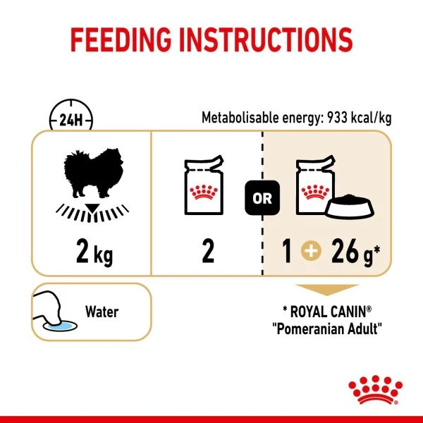 Prebiotics and Psyllium are included in this recipe to further support your dog’s intestinal health. To appeal to each dog’s appetite, ROYAL CANIN® Pomeranian Adult is also available as dry food with crunchy, tailor-made kibble that’s specifically crafted to suit the size and shape of the Pomeranian’s jaw. If your dog enjoys a diet of both wet and dry food, be sure to check the on-pack feeding guides to make sure you provide an accurate amount of each.