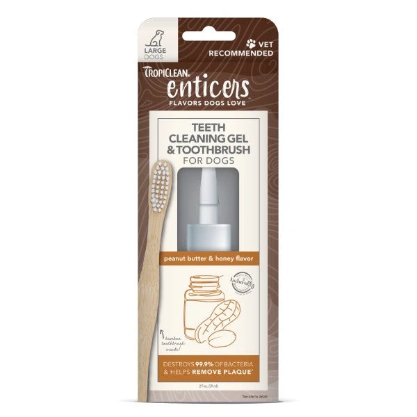 TropiClean Enticers Teeth Cleaning Gel – Peanut Butter & Honey Flavour will have your dog begging for a toothbrushing. The sweet, nutty flavours of peanut butter and honey will make toothbrush time your dog’s