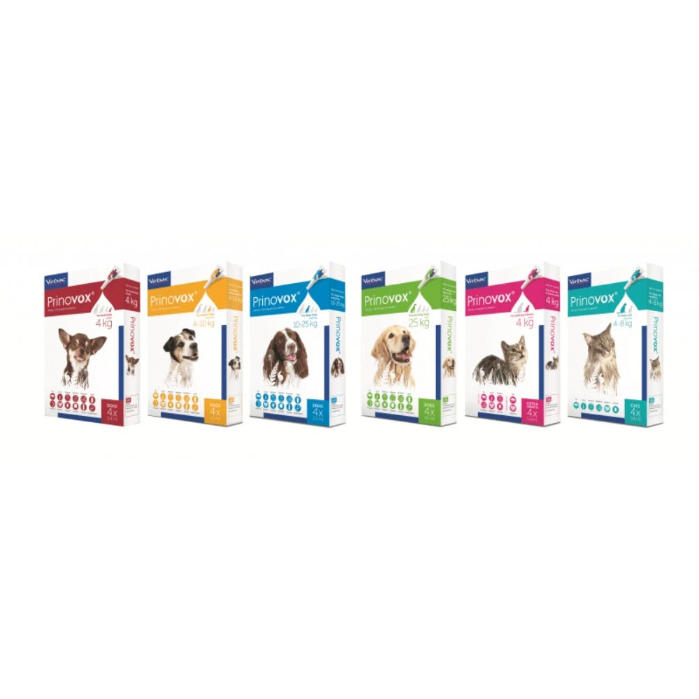 Prinovox is a new spot-on parasiticide. Using the same proven and highly effective formulation as the market leader, Prinovox prevents and treats fleas, lungworm, lice, mites, heartworm and roundworm in dogs. Use it monthly to keep your pet flea-free for up to four weeks and to protect it from these other common parasites.